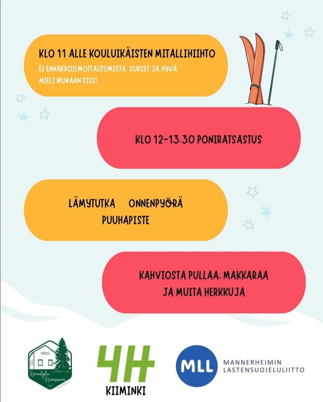 Lasten mitalihiihto, poniajelua, lämytutka, onnenpyörä, puuhapiste ja kahviosta kuumaa makkaraa ja muuta purtavaa!